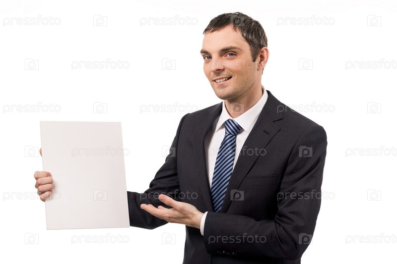 Изображение успешного мужчины, указывающего на пустую бумагу и смотрящего в камеру с улыбкой