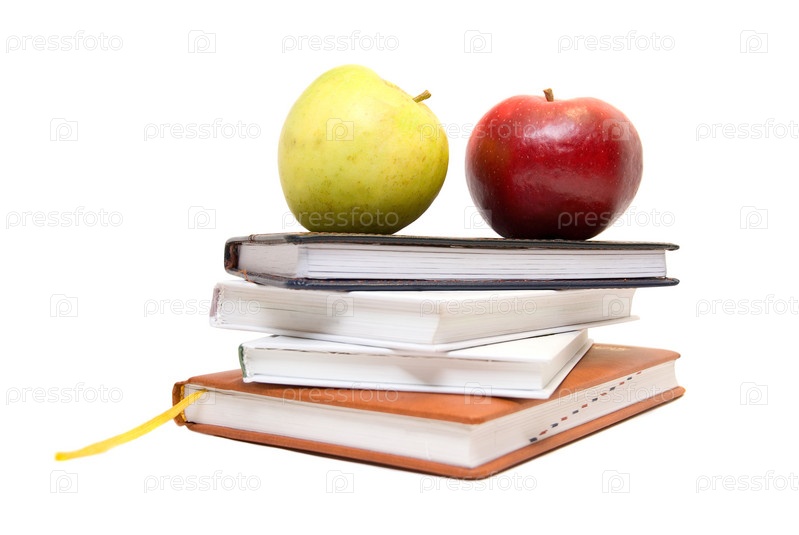Концепт "Снова в школу»: книги и яблоки на белом фоне
