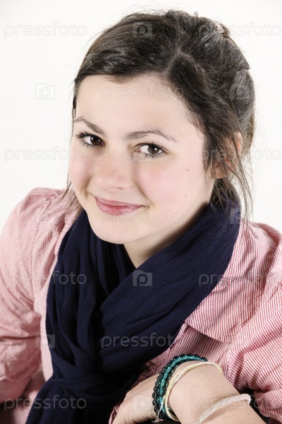 Девочка с каштановыми волосами, улыбаясь в камеру