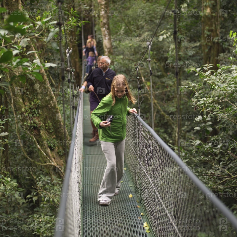 Люди, идущие на подвесной мост