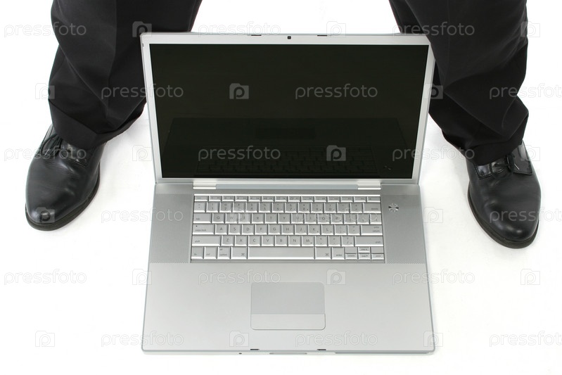 Мужчина с ноутбуком между его ног