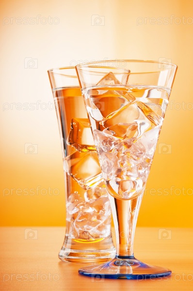 Вода со льдом с бокалах на оранжевом фоне