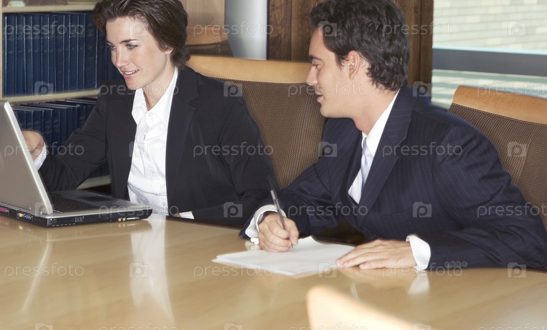 Два деловых людей, обсуждая их работу с ноутбуком в зал Совета