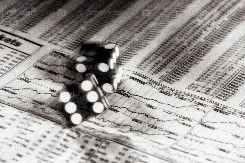 Крупным планом пары костей на бумаге фондового рынка