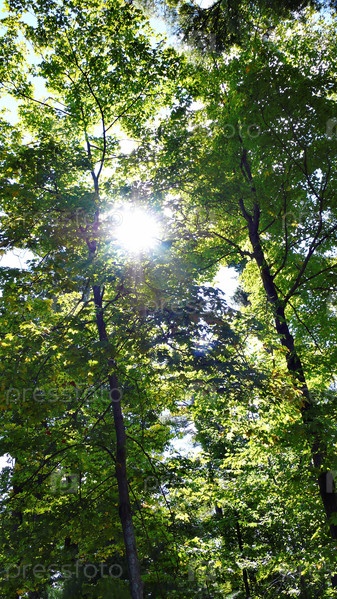 Солнце через лесных деревьев