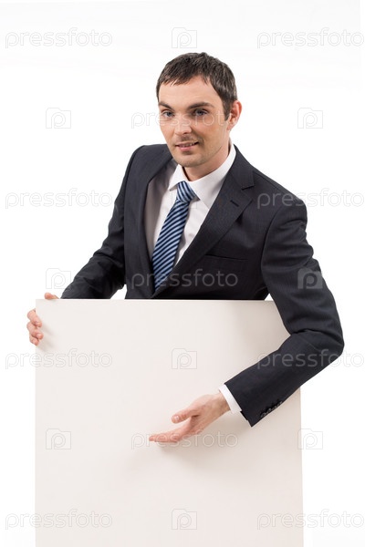 Изображение успешного мужчины, держащего руку на пустой бумаге и смотрящего в камеру с улыбкой