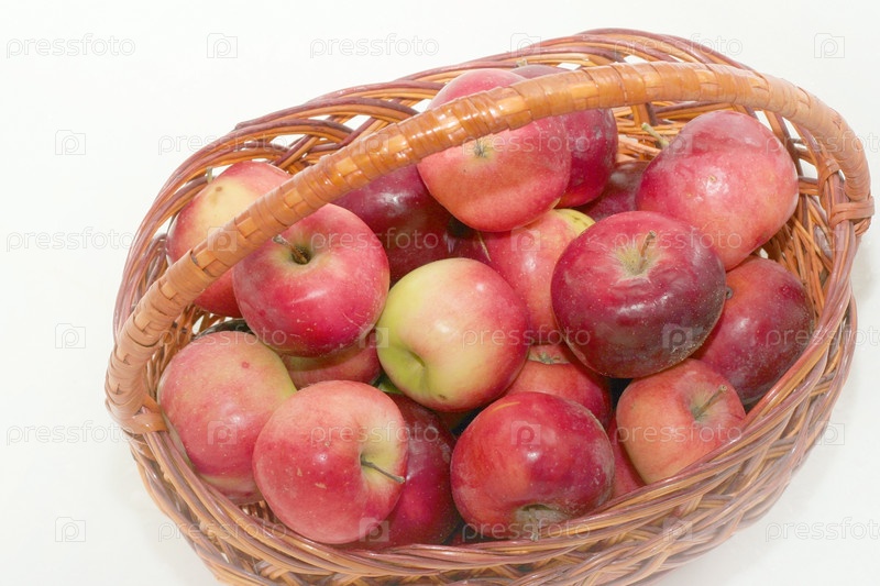 Спелые красные яблоки в плетеной корзине на белом фоне