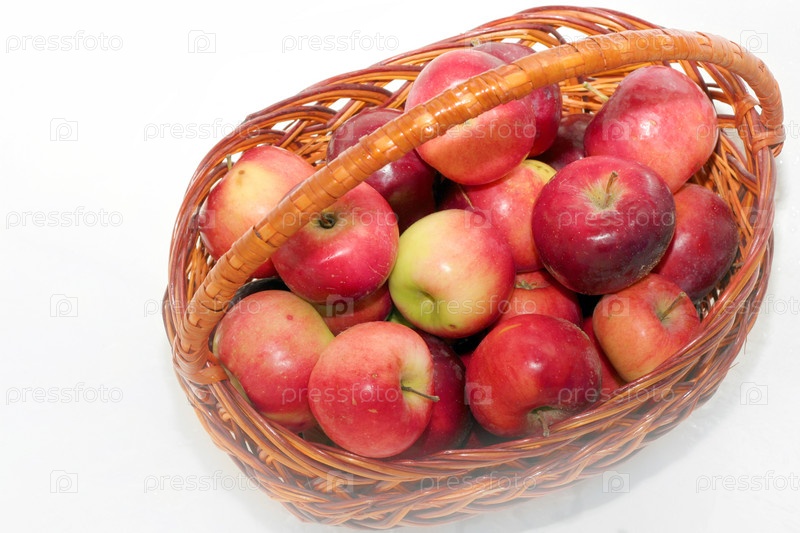 Спелые красные яблоки в плетеной корзине на белом фоне