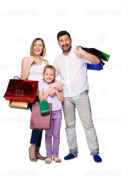 Счастливая семья с сумки, стоя на студии
