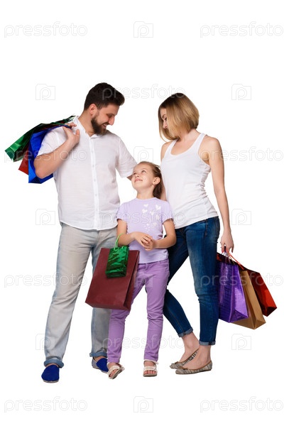 Счастливая семья с сумки, стоя на студии