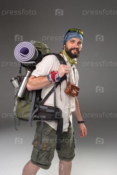 Портрет улыбающееся мужского полностью оборудованная турист