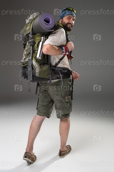 Полная длина вид сзади мужчин полностью оборудованная туристическая