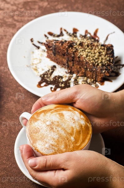 Чашка капучино в женских руках и тарелка с кусочком торта
