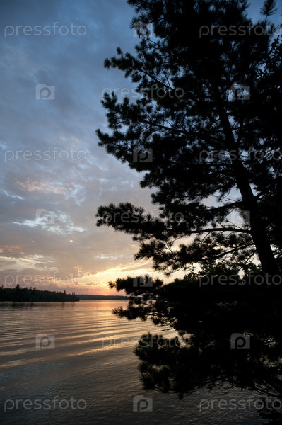 Закат солнца за вечнозеленое дерево на озеро древесин, Онтарио