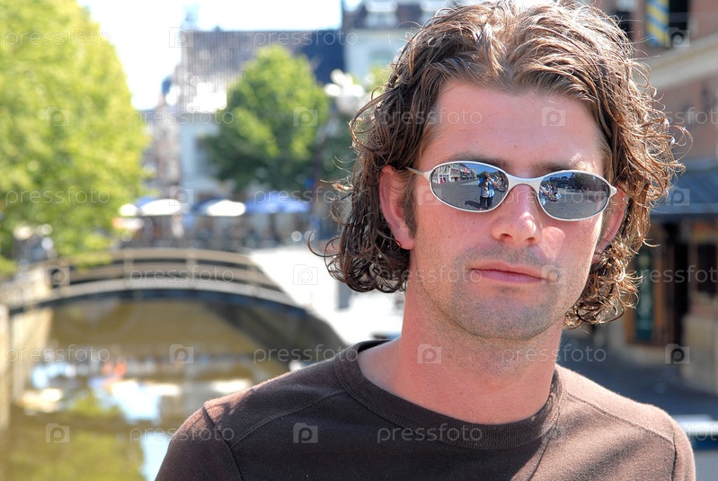 Закрыть человека носить солнцезащитные очки на мосту канала