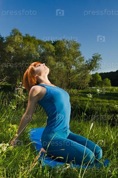 Красивая рыжая женщина занимается фитнес-йогой в летний день
