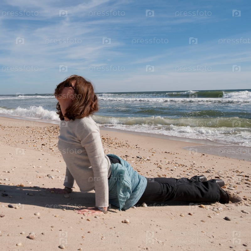 Женщина в позе йоги на пляже в Хэмптонсе