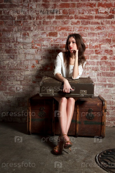 Красивая девушка с чемоданами на фоне кирпичной стены
