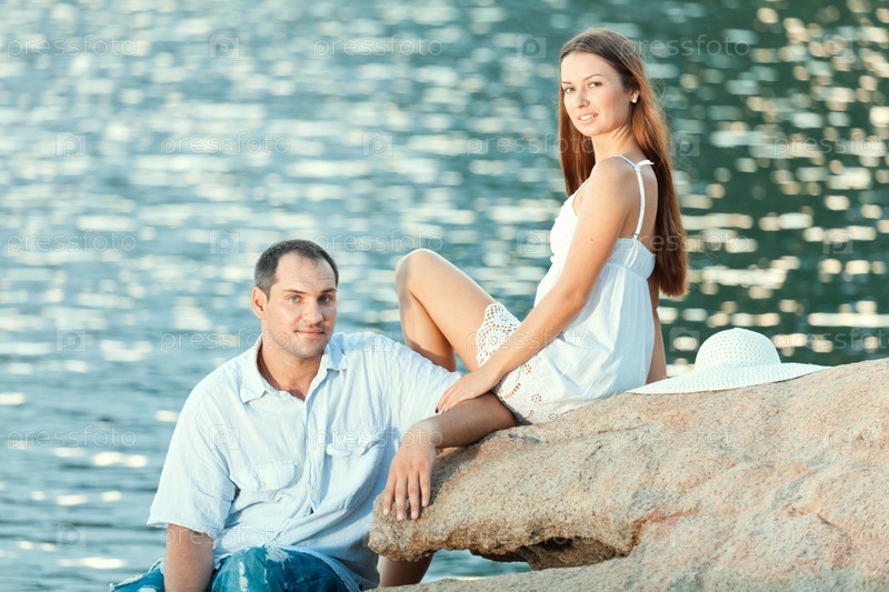 Молодая влюбленная пара на берегу моря