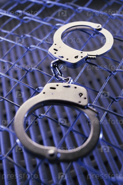 Крупным планом пара наручников на заборе