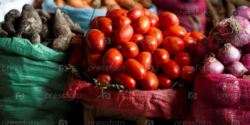 Овощи для продажи в магазине, Священная долина, регионе Куско, Перу