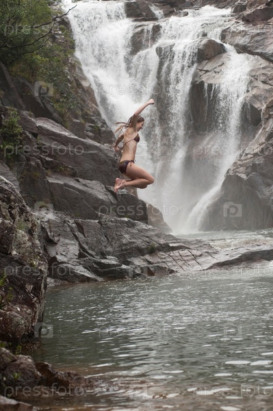 Девочка прыгает со скалы в горное озеро на фоне водопада