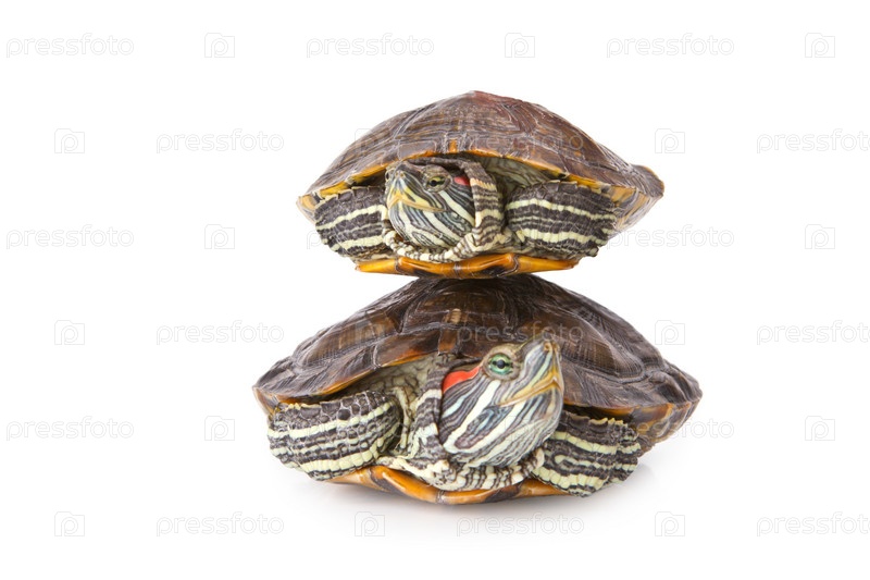 Две полосатые черепахи на белом фоне