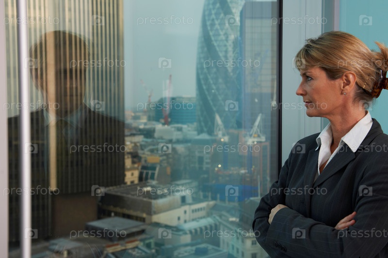 Бизнес-леди, глядя из окна с отражением деловой человек, оглядываясь назад