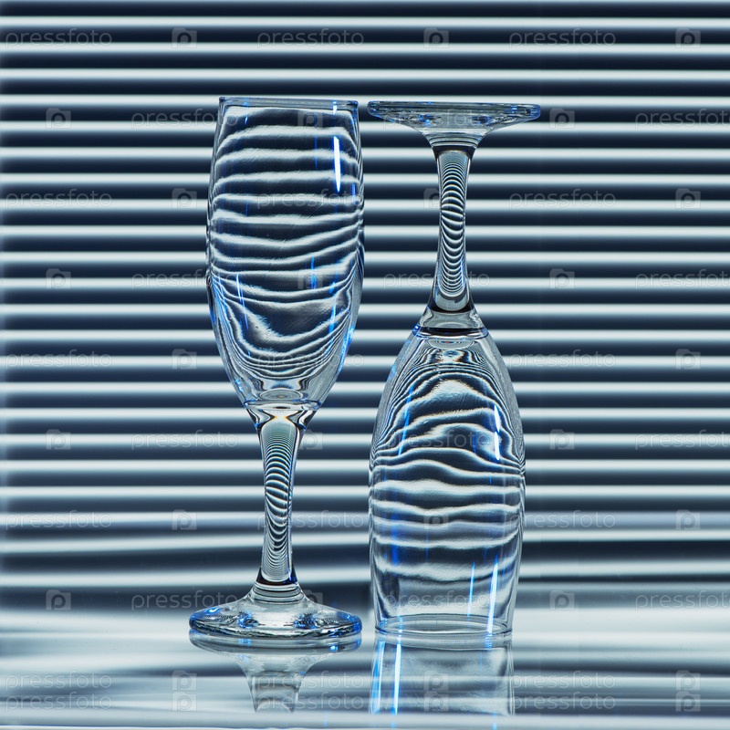 Два пустых стеклянных бокала с отражениями на фоне жалюзи