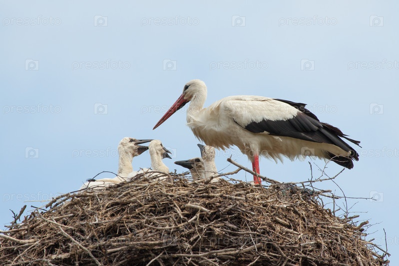 Птенцы белого аиста в гнезде с одним из родителей
