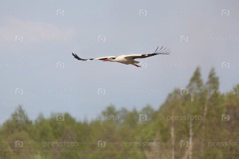 Белый аист парит над верхушками деревьев с расправленными крыльями