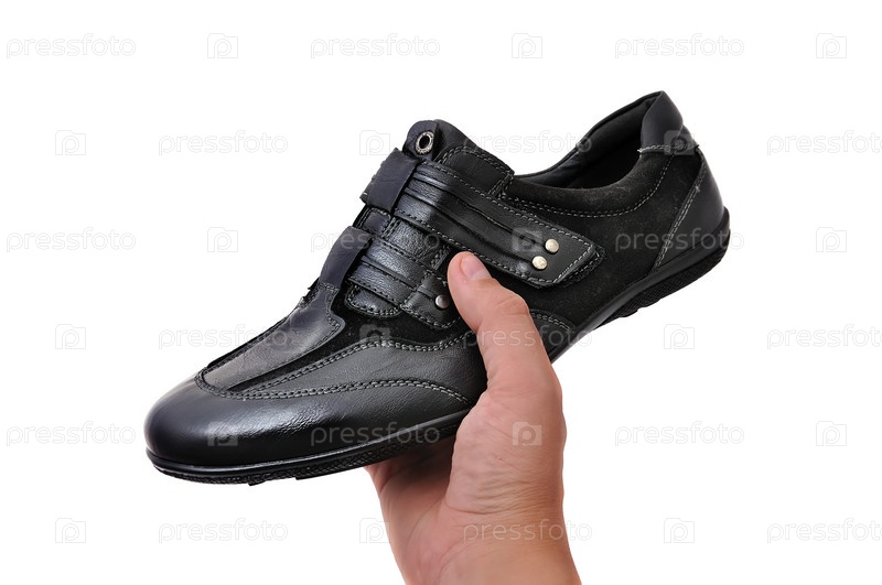 Черный спортивный туфель в руке на белом фоне