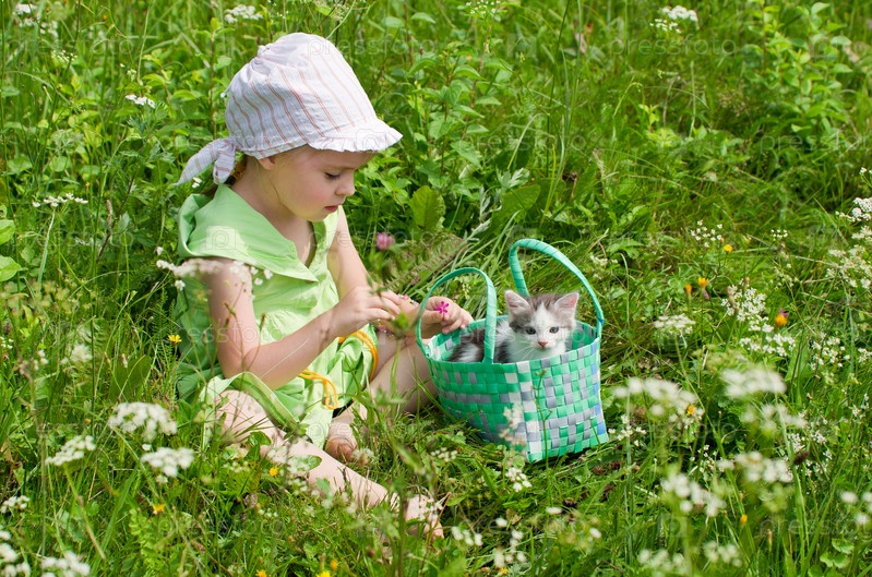 Девочка сидит с котенком в корзинке на зеленой траве