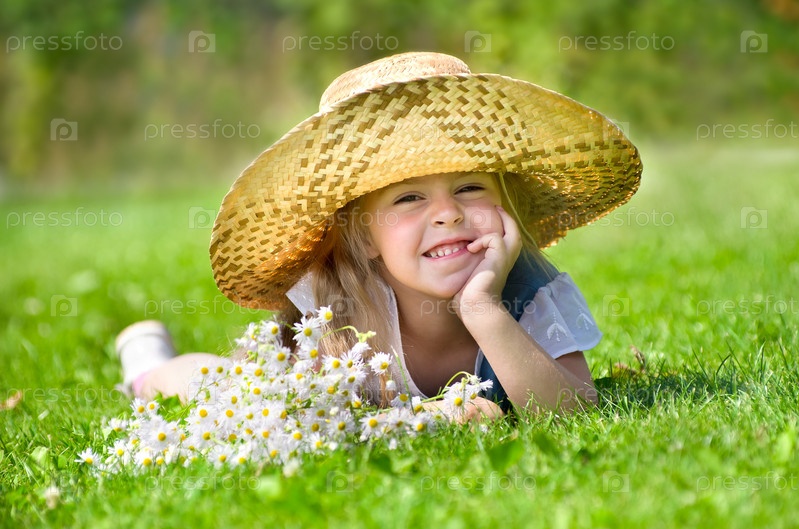 Девочка в соломенной шляпе лежит на зеленой траве