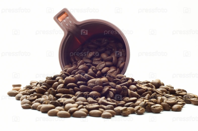 Пластиковая кружка и зерна кофе на белом фоне