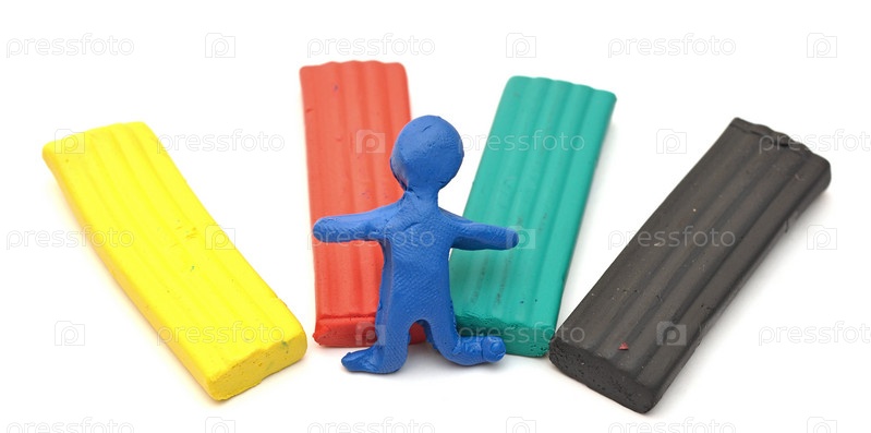 Цветной пластилин и фигурка человечка на белом фоне