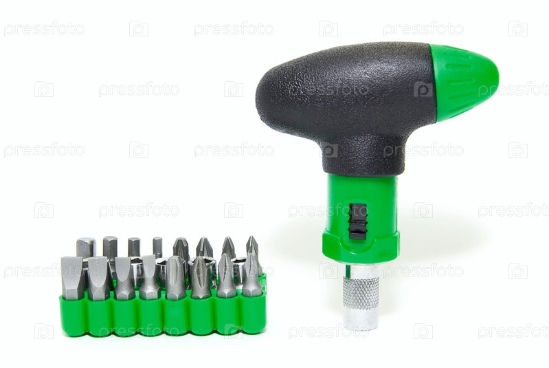 Зеленая отвертка и набор насадок на белом фоне