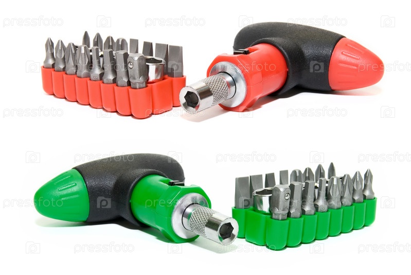 Красная и зеленая отвертка и набор насадок на белом фоне
