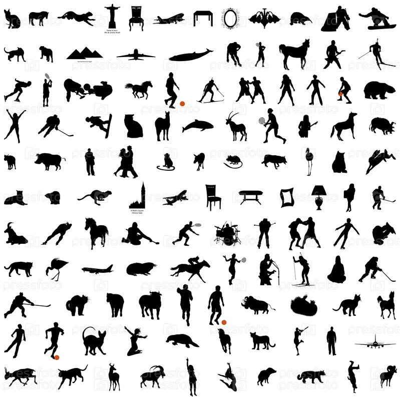 Набор силуэтов животных, предметов, людей на белом фоне