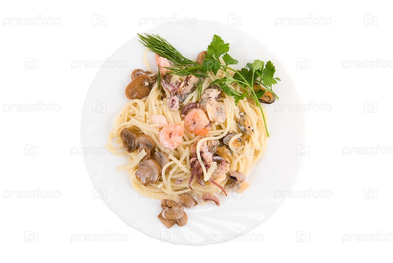 Паста с морепродуктами и грибами на белой тарелке