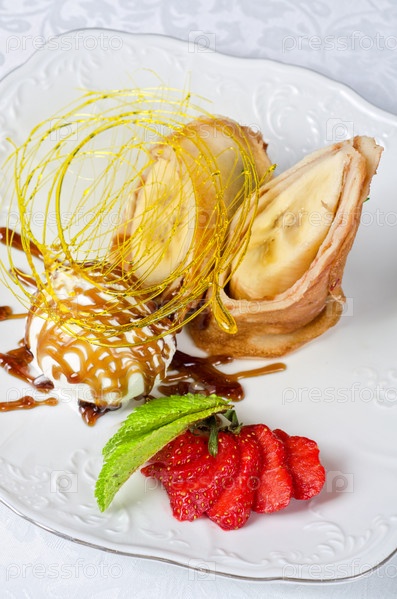 Десерт из блинов с бананом и кусочка мороженного