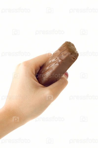 Шоколадный батончик в руке на белом фоне