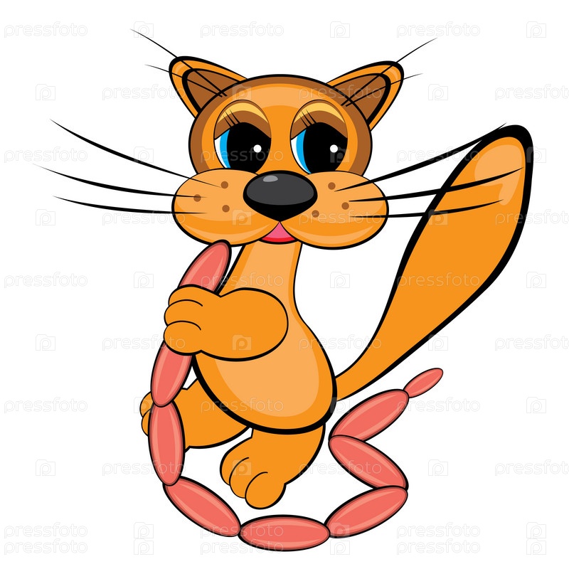 Счастливая кошка с сосисками, иллюстрация на белом фоне