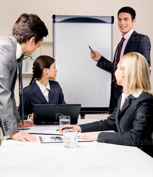 Фото серьезных партнеров, слушающих успешного бизнесмена, читающего им лекции во время обучения