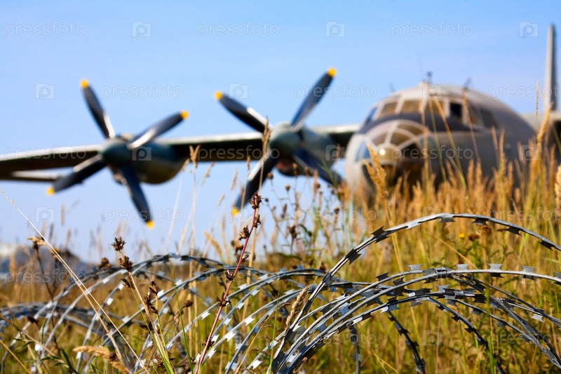Колючая проволока и самолет на заднем плане