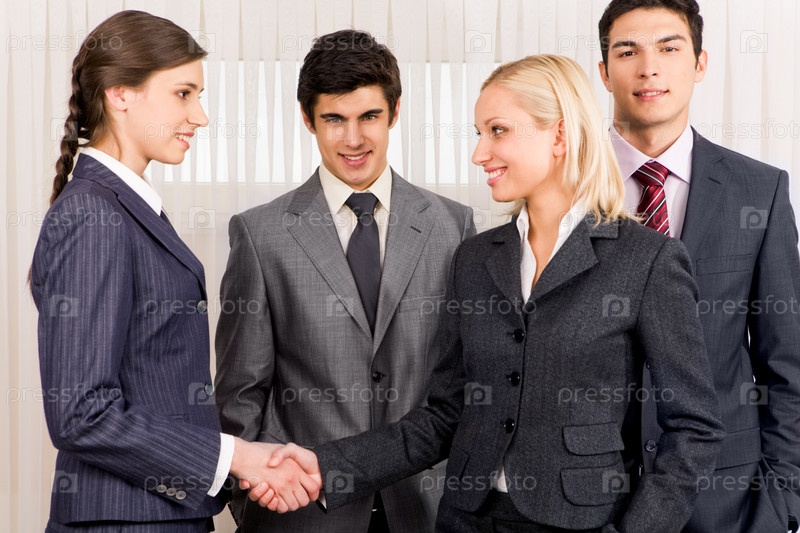 Фото успешных деловых партнеров, обнимающихся после заключения сделки, в то время как их коллеги рядом