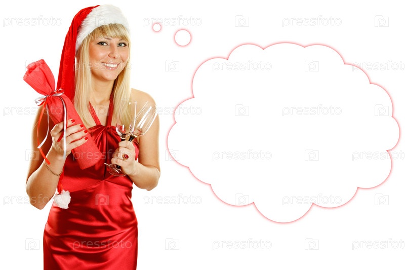 Портрет молодой девушки в шапке Санта-Клауса с шампанским и бокалами в руках на белом фоне