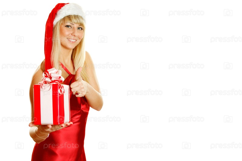 Портрет молодой девушки в шапке Санта-Клауса с подарком в руках на белом фоне