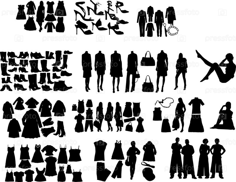 Коллекция черных силуэтов людей и различной одежды на белом фоне