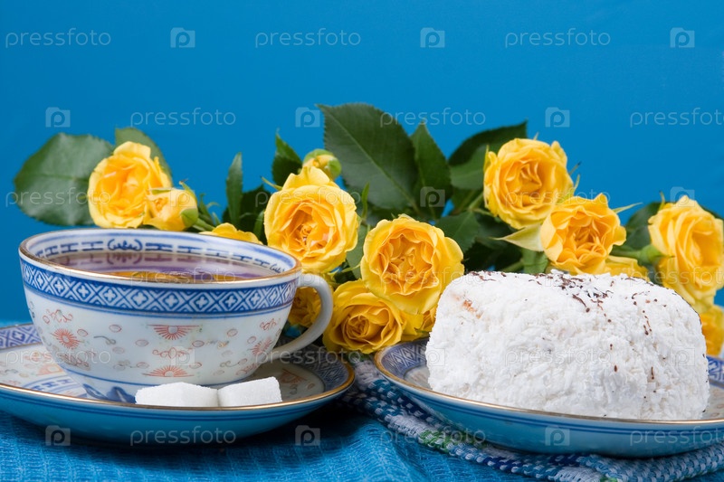 Чай, торт и розы на голубом фоне